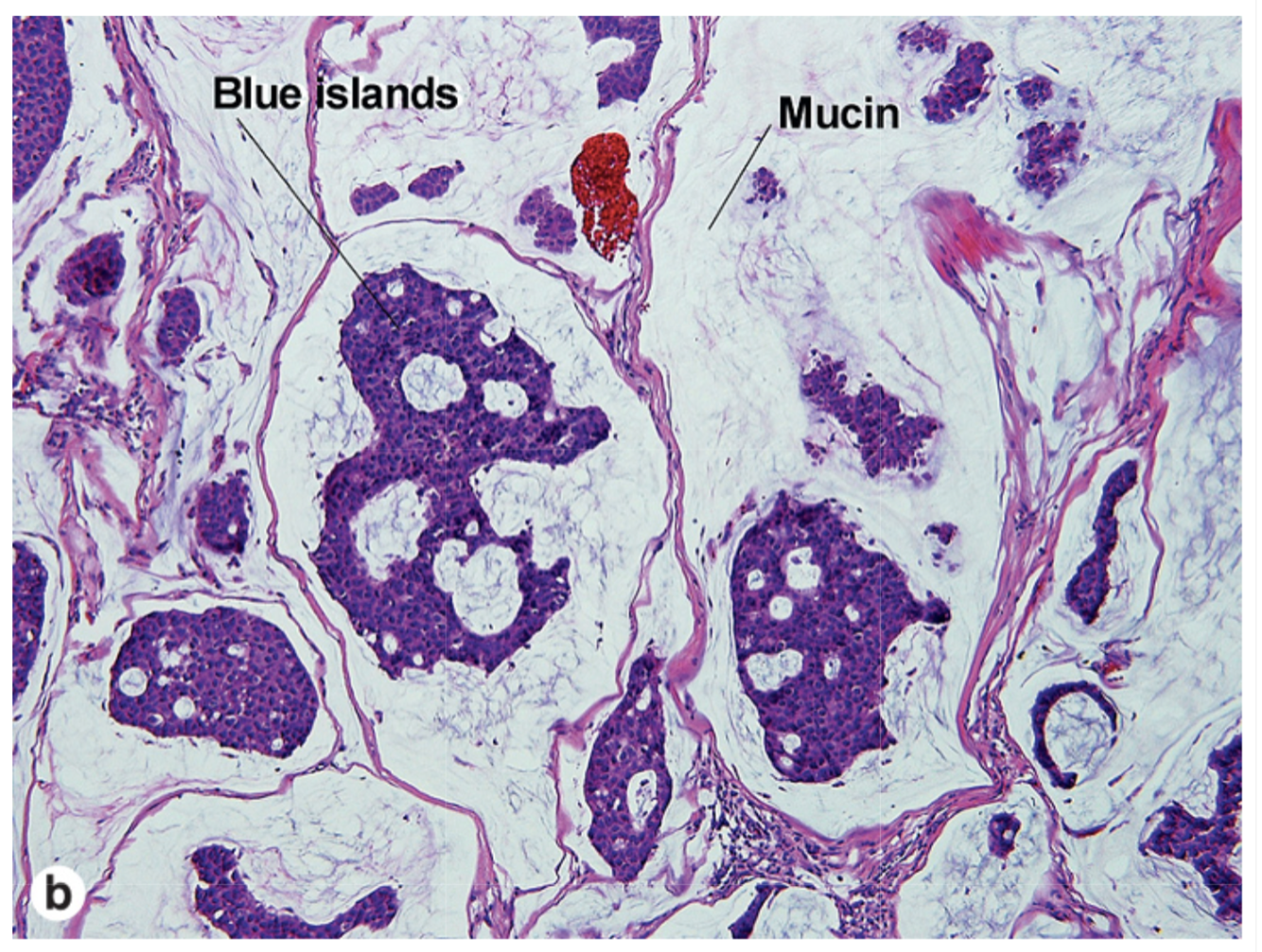 Islands of blue cells surrounded by mucin