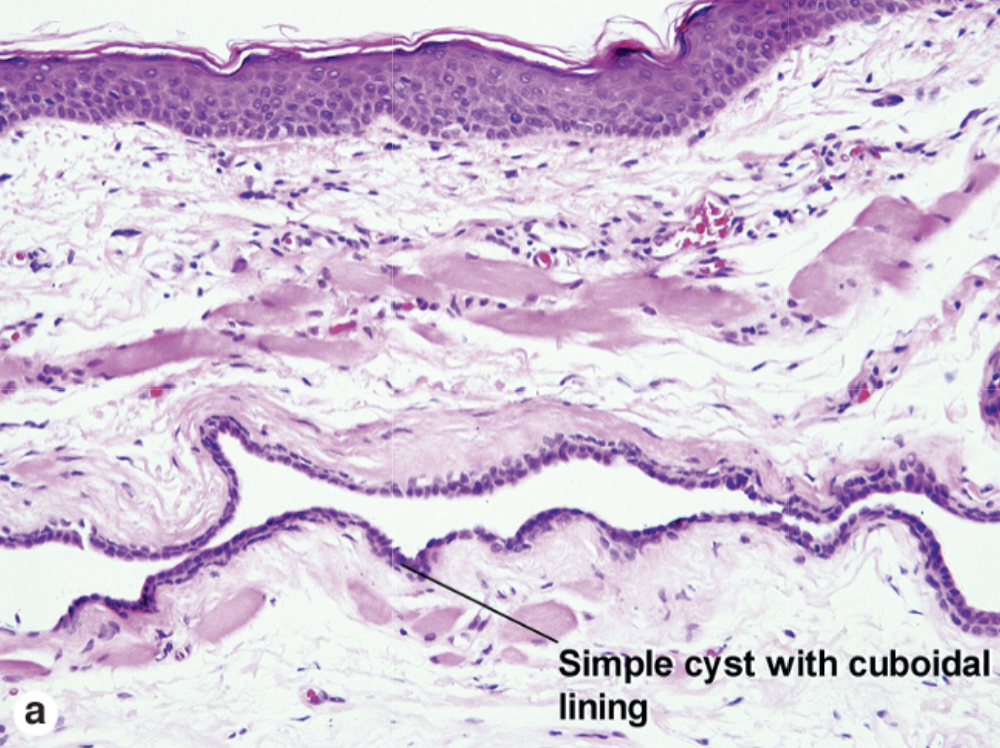 What are the histologic features of a hidrocystoma?