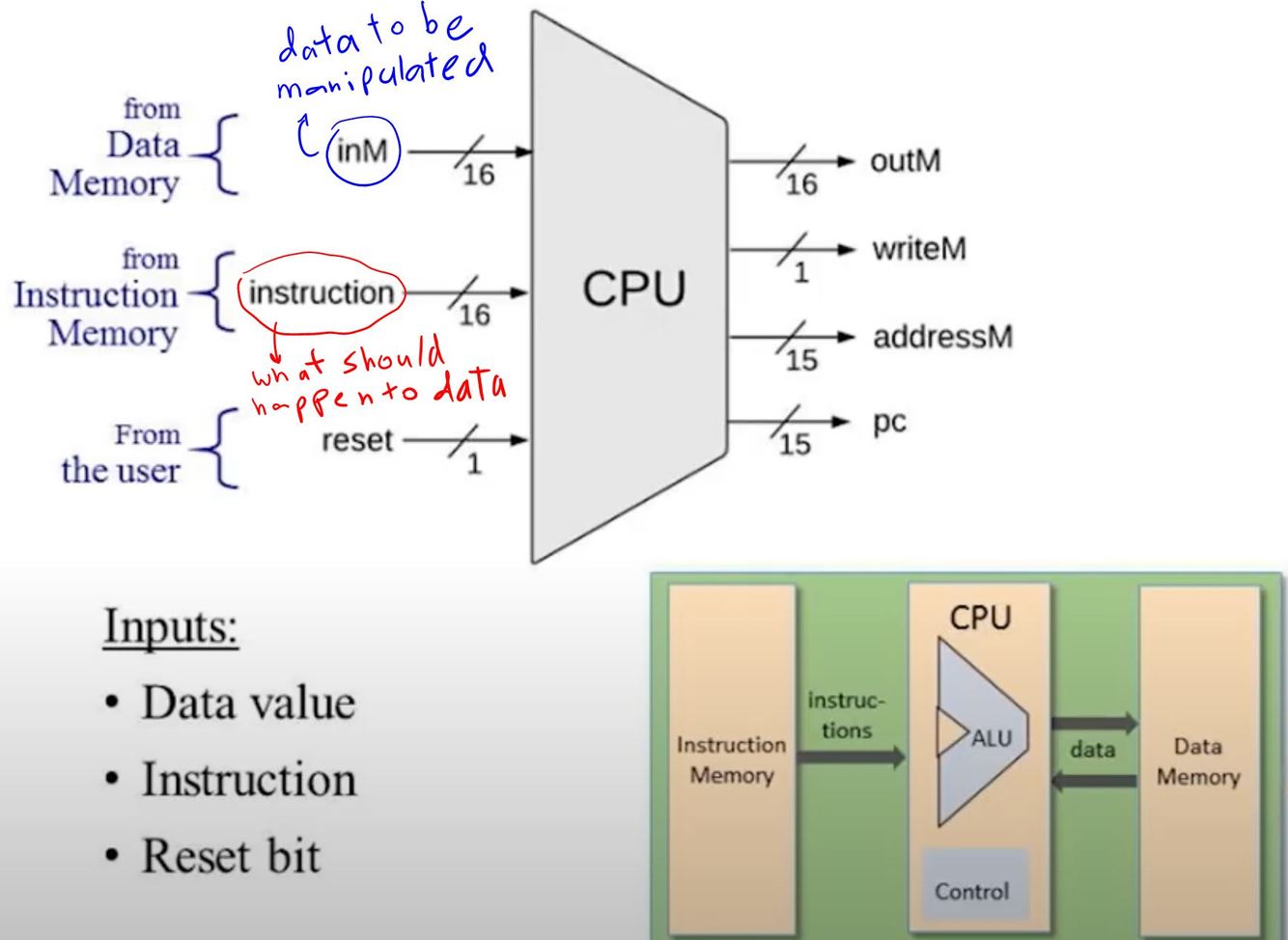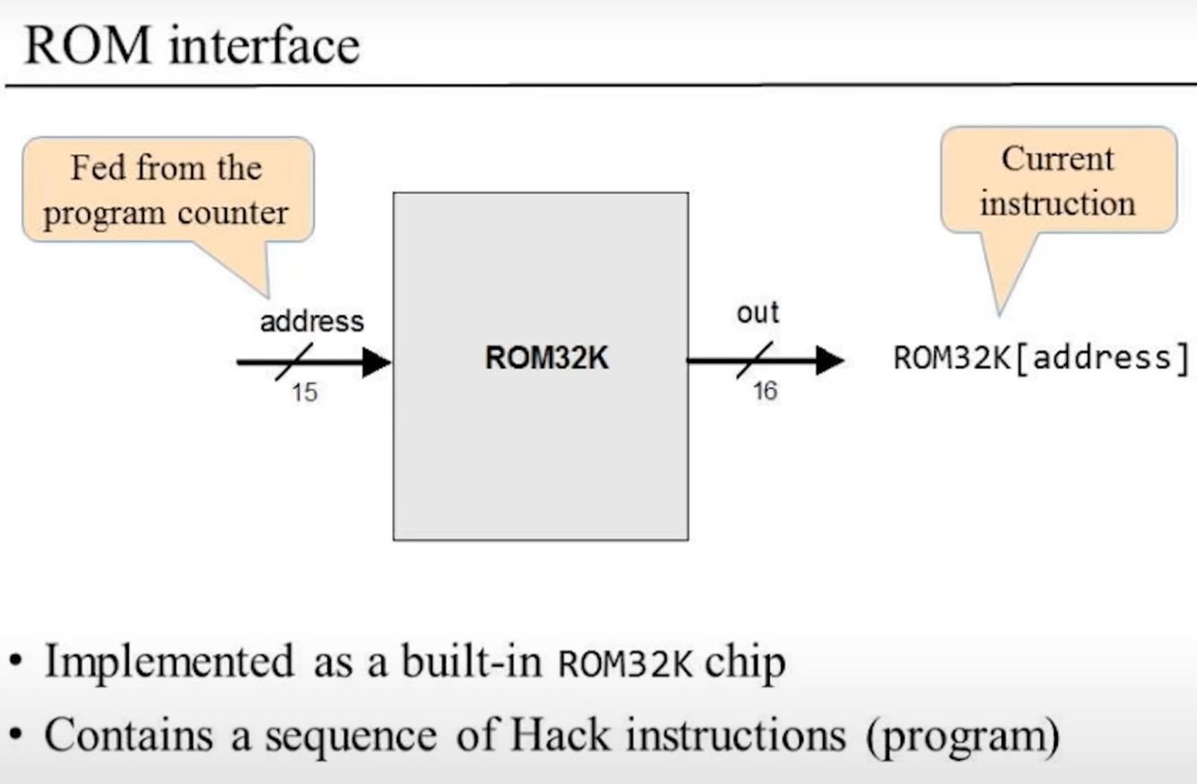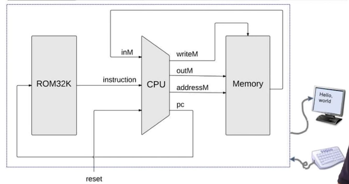 The Hack CPU consists of the ALU built in project 2 and three registers called data register (D), address register (A), and program counter (PC), identical to the 16-bit registers built in project 3.