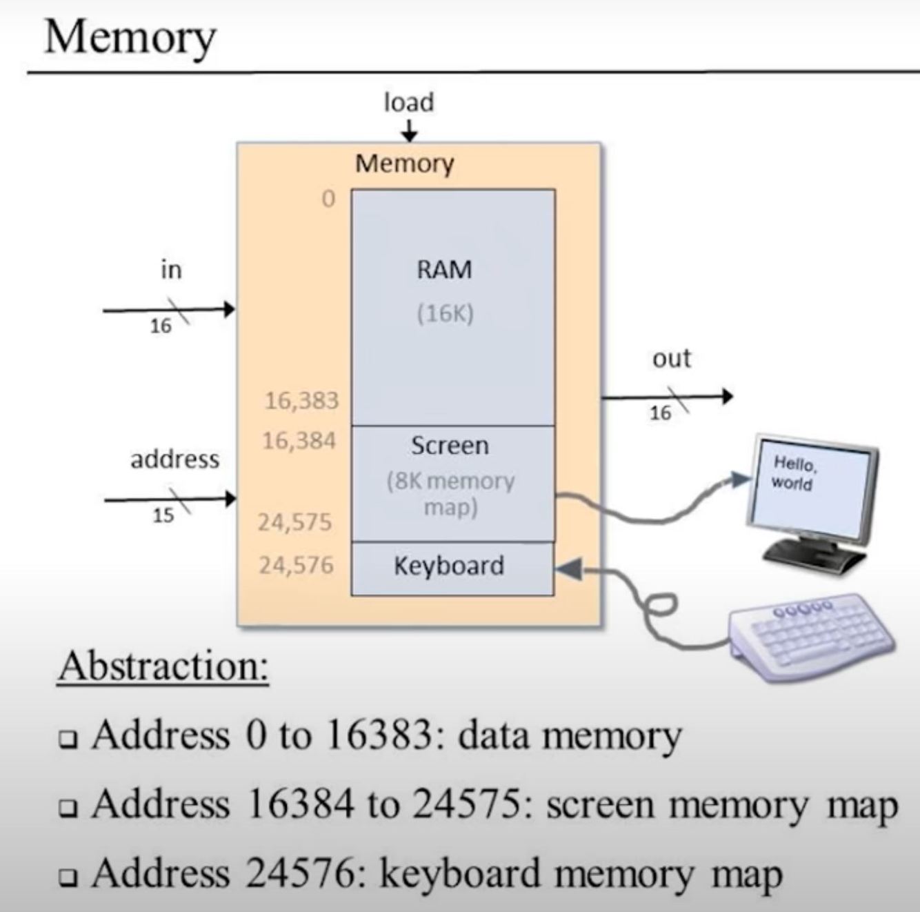 Data Memory: High-level programs manipulate abstract artifacts like variables, arrays, and objects. After the programs are translated into machine language, these data abstractions become binary codes, stored in the computer’s memory