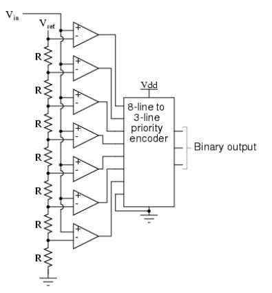 it consists of a huge number of comparators and long chain of precision resistors to create all the different test voltages between positive and negative reference voltages. A set of combinatorial logic then combines the outputs of the comparators to create the digital output signal