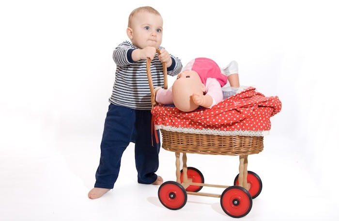 Child links schemes in SIMPLE combinations (putting baby in carriage, then pushing it)
