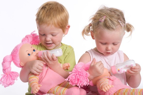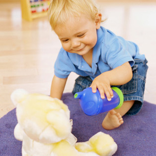2) Child has inanimate objects perform familiar activities (doll washing itself)