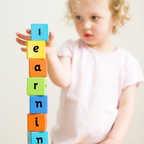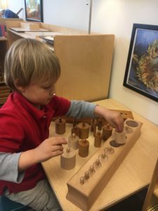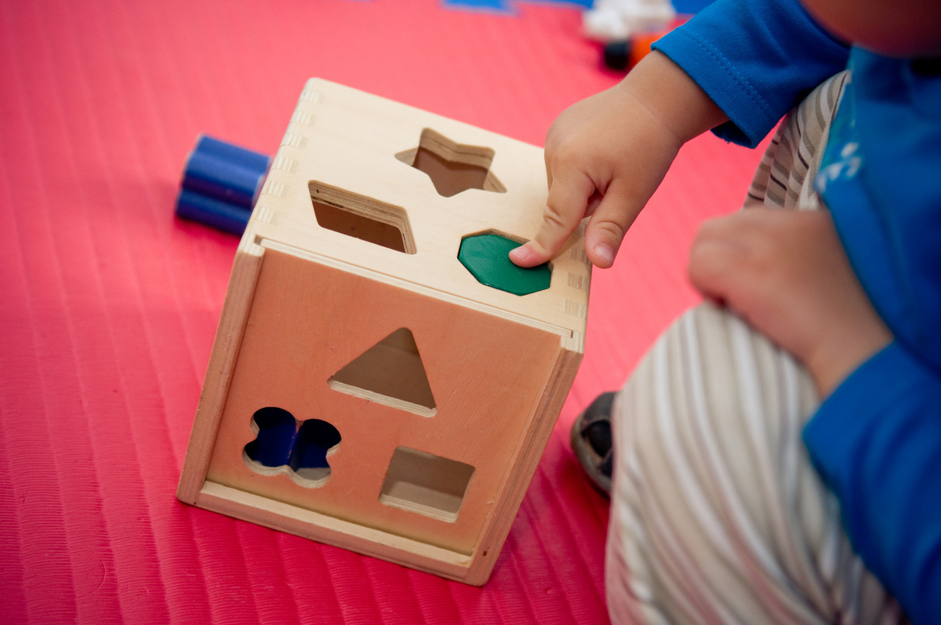 2) Child matches circles, squares, triangles, and manipulates objects into small openings (shape sorter)