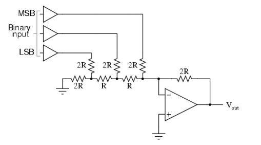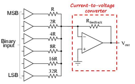 A weighted resistor DAC has a set of resistors that are connected together at one end and individually driven high or low at the other. These are then connected to a current-to-voltage converter.