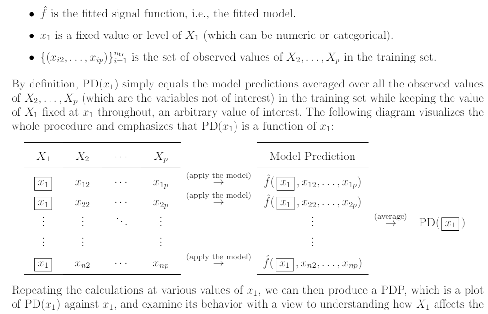1) Partial (or average) dependence plots visualize the marginal effect of a given predictor on the target variable, i.e., the association between the two variables after averaging out the values or levels of other predictors not of interest. Improves on variable importance scores by shedding light on the directionality of the relationship.