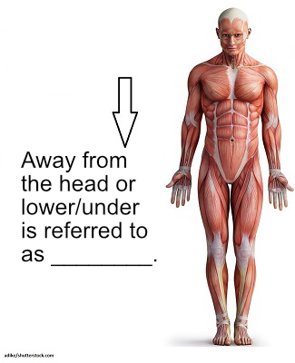 Below a body part or nearer to the feet.