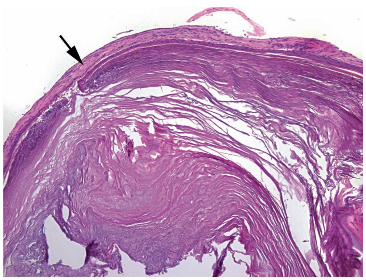 Arrow: Thin epithelium surrounding the keratin debris