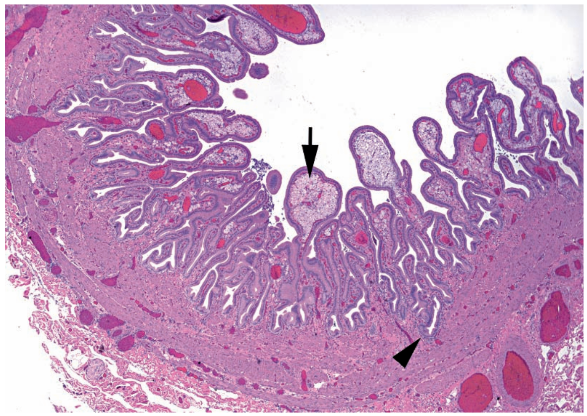 Arrow: Foamy macrophages distending mucosal folds