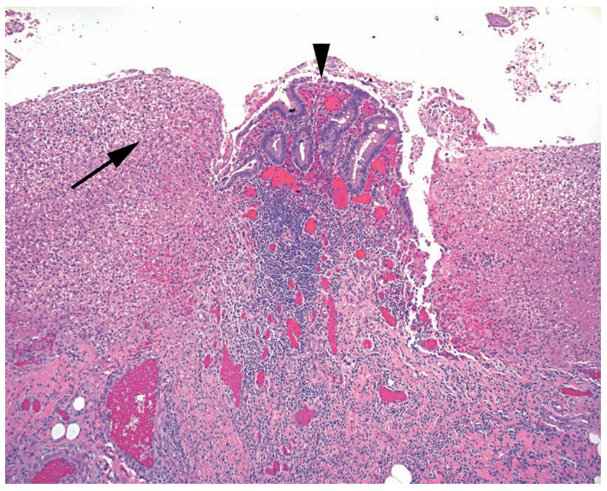 Arrow: Tiger-stripe layers of eosinophils, mucin, and cell debris.