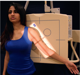 Elbow and shoulder joints visible, but slightly distorted due to beam divergence
