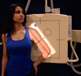 The patient stands or lies with the arm slightly abducted from the body, and the hand supinated.