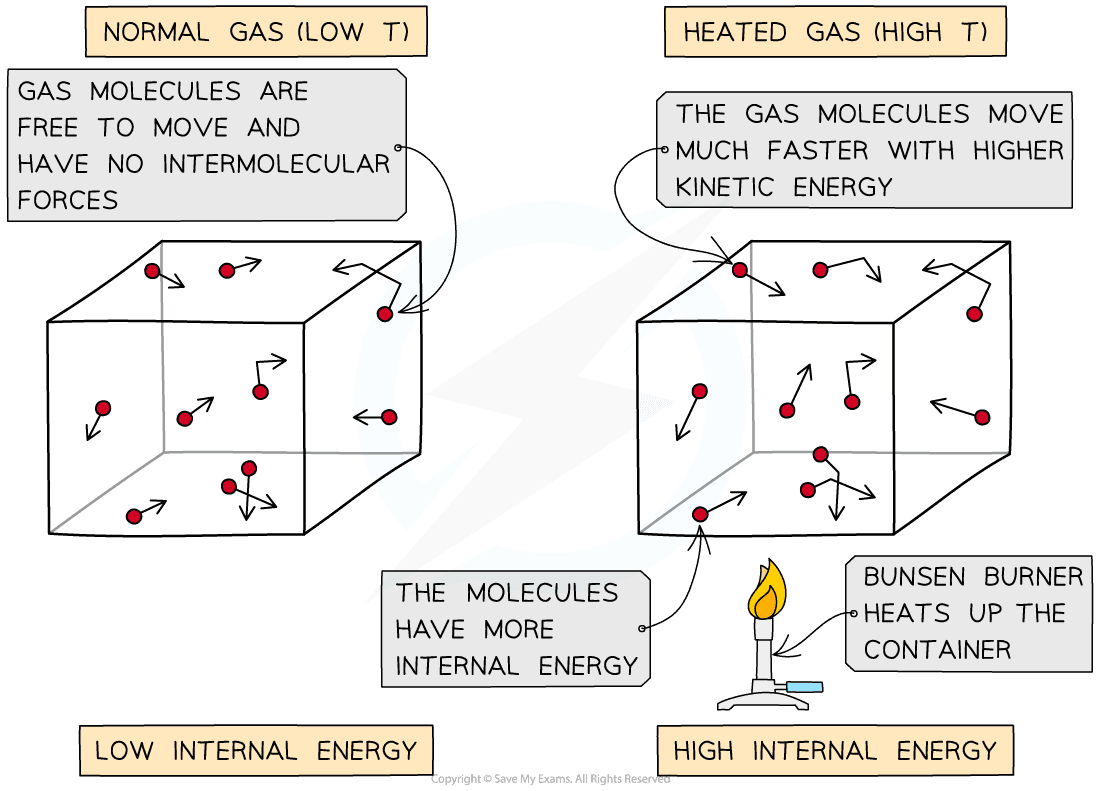 As the container is heated up, the gas molecules move faster with higher kinetic energy and therefore higher internal energy