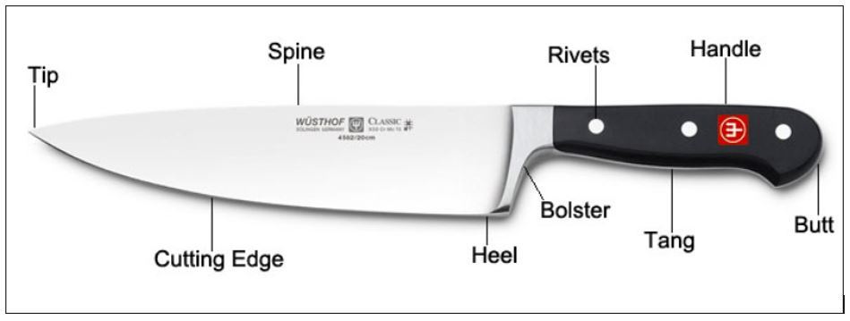 TANG - piece of metal extended from the blade that fits into the handle (good knives have at least 3/4 tang)