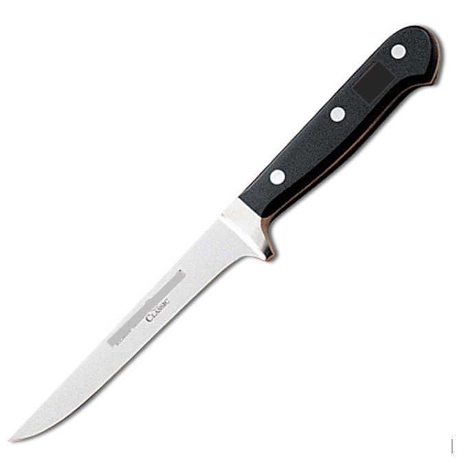 Used for fabricating raw meat. Blade is 6-14”, rigid, and curves upward 25 degrees at the tip.