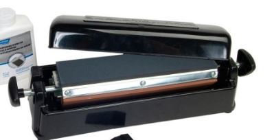 A flat brick of synthetic abrasives that are used to put an edge on a blade. Various grit and sizes are available.