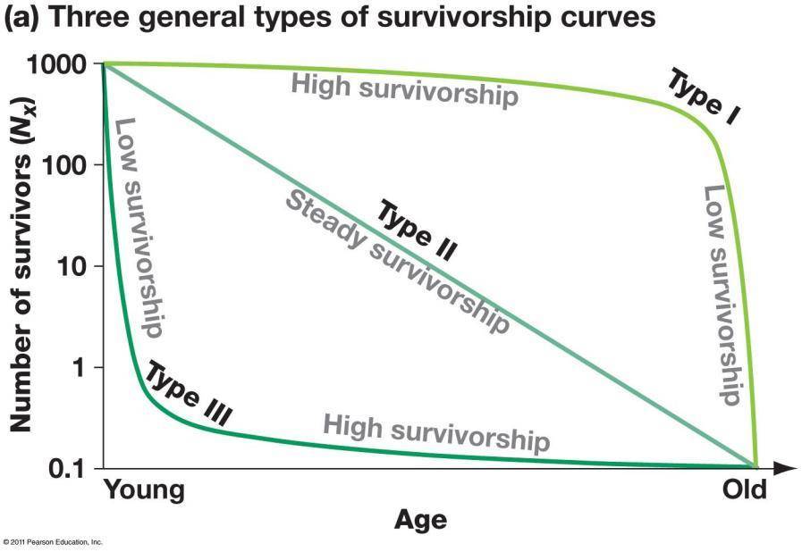 survivorship is high throughout life, most hit the max life