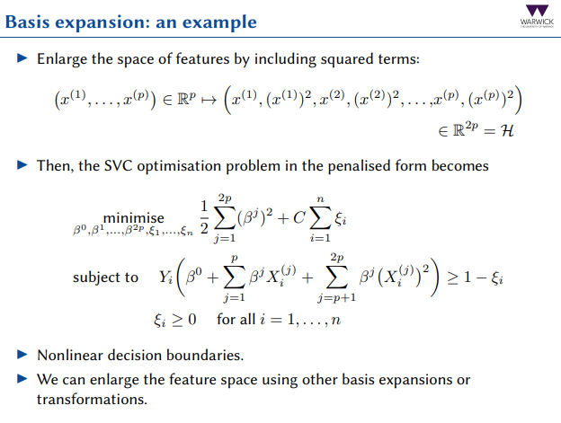 How do we use basis expansion in SVC optimisations to enlarge the space of features by including squared terms?