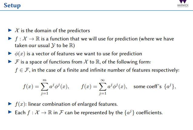 What is the mathematical setup, features and variables used in the kernel method?