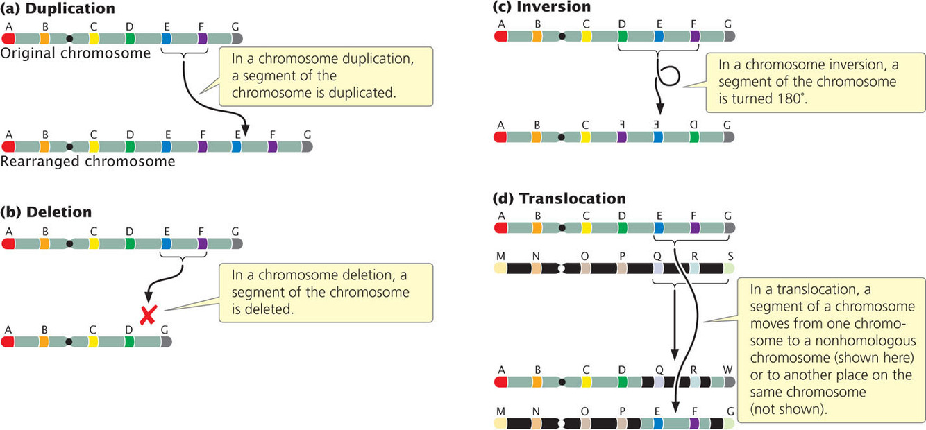 *Duplication, deletion, inversion, and translocation have all played a huge role in evolution, allowing for alterations in genetic change. Mutations that allow organisms to change and outcompete- which has to do with how chromosomes are arranged.