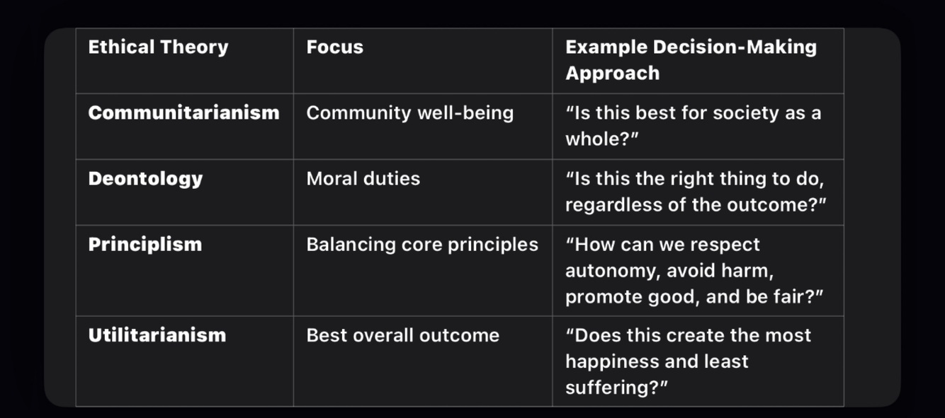 • Principlism = balancing ethical principles (e.g., “What is fair, just, and respects autonomy?”)