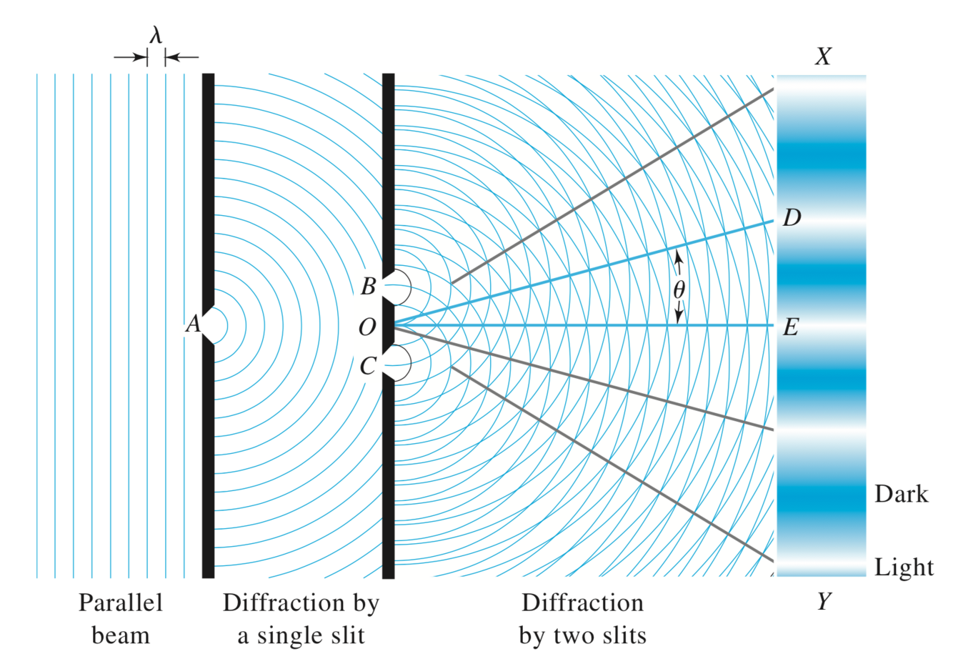 Diffraction of electromagnetic energy through two slits, must be coherent such that waves of the same frequency and phase relationship to create the band pattern imaged below