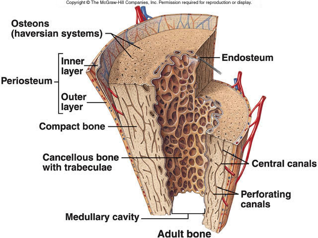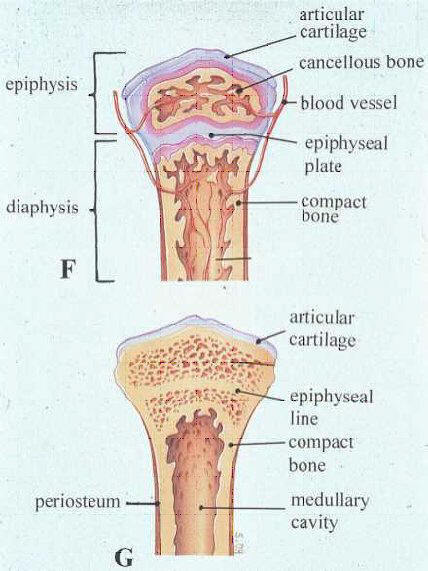 diaphysis, epiphysis, metaphysis, articular cartilage, periosteum, endosteum, marrow, medullary cavity