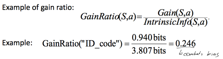 intrinsic_info(1,1, ,1) = 14 x( - 1/14 x log1/14)= 3.807 bits Importance of attribute decreases as intrinsic information grows.