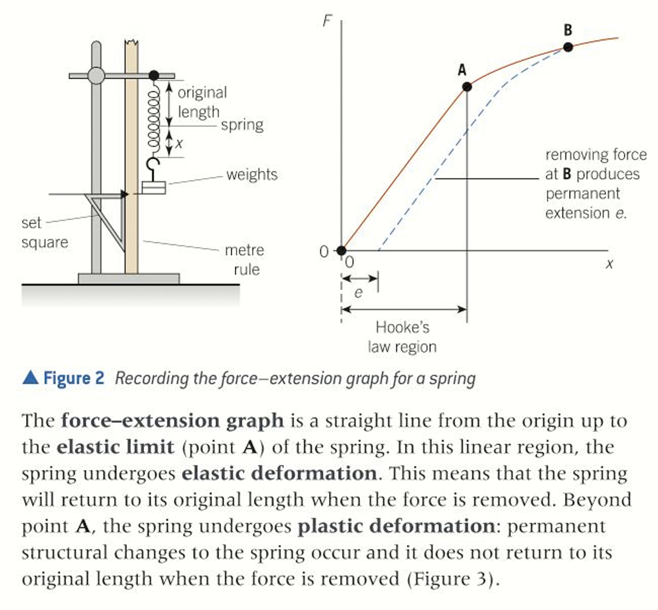 Describe a force extension graph in terms of extension, elastic limit, and the two different types of deformation.