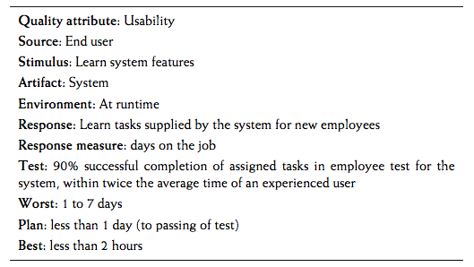 Quality attribute scenario: quality requirements specification in a language common to both users and developers.