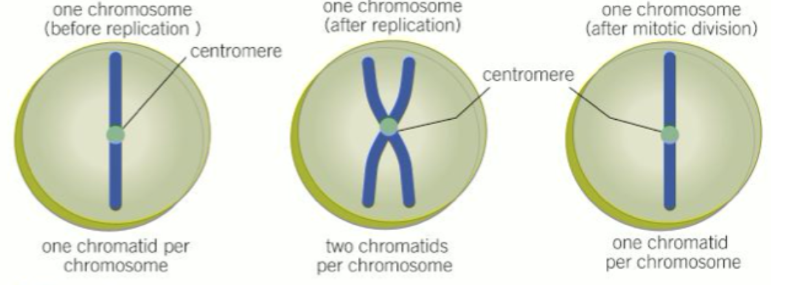 Each DNA molecule (chromosome) is converted into two identical DNA molecules, called chromatids.