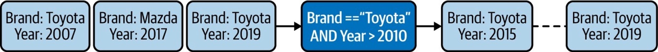 If we are processing a real-time stream of car sales and are interested in only 2010 or newer Toyota vehicles, we can define a filtering condition as shown in Figure 6-3 to emit only events that satisfy the condition.