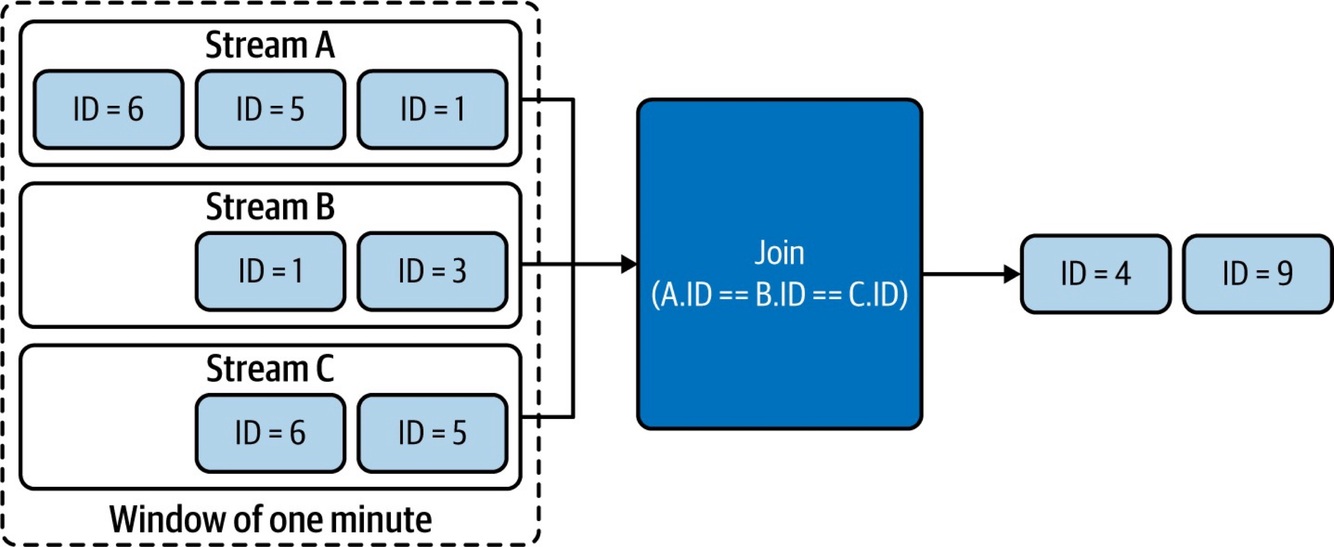 This pattern works by defining a condition to identify the joining events. This condition will pick attributes from each joining event stream and define the condition under which they should be joined. This can be a simple equal condition, like joining events from all event streams having the same ID, or it can be more complex. The join should also define a buffer that determines how long events should wait for corresponding events to arrive from other event streams. This buffer period can be common across all streams or can vary among streams. Most stream-processing systems define this buffer period via windows.
