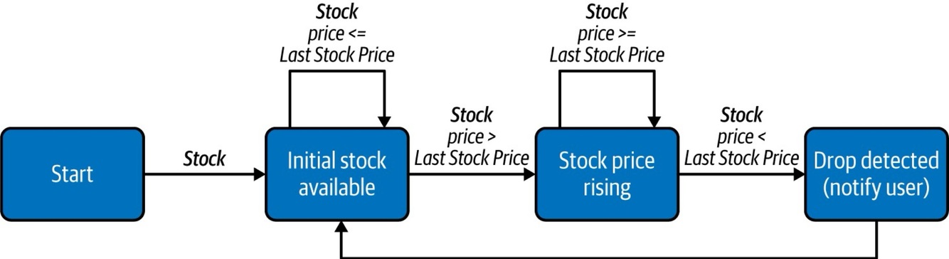 This pattern can also be used to identify sequences of events that are immediately followed by one another or scattered randomly among other events. We can also use this to detect the nonoccurrence of events by combining state transitions with time-outs.