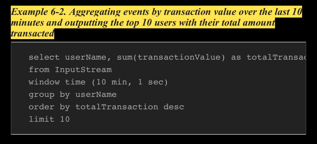 It is also important to consider that we cannot implement all types of aggregations with high accuracy and efficiency. For example, we can use windows to model the mean (average), but not the median. The mean needs only the sum and the count of events in the window, and techniques can be used to progressively alter these values as events are added and removed from the window. This enables us to rapidly compute the average (sum/count) by not iterating through all the events in that window. But on the other hand, to calculate the median, we need to iterate through all the events in the window. This will not only add latency to the calculation, but persisting all events requires more space, which becomes more problematic as windows get larger.