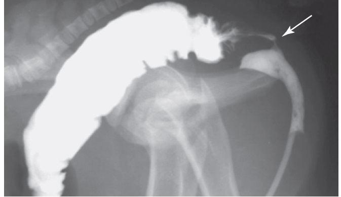 A positive contrast urethrogram in a 3-day-old burro thatpresented with atresia ani and intermittent passage of fecal material fromthe urethra. A catheter was passed via the urethra and contrast agentwas injected, resulting in accumulation of a large amount of contrastagent in the rectum and a lesser amount in the intrapelvic portion of theurethra. A small amount of contrast agent can be seen in the urethrorectalfistula (arrow).