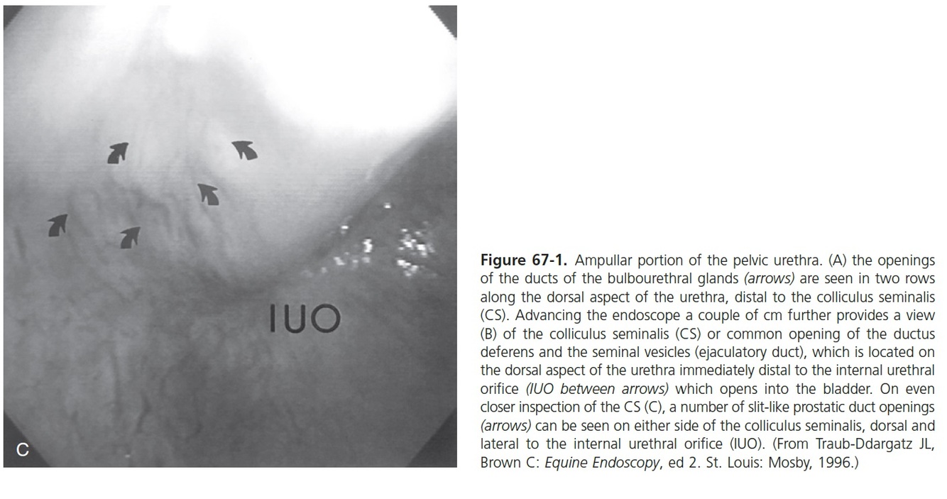The colliculus seminalis is found a few cms caudal to the urethral orifice. It is the site of the paired ejaculatory ducts, which are the common openings of the ductus deferens and ducts of the seminal vesicles.