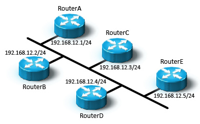 *You have a medium-sized business network with twelve subnets (192.168.1.0/24 through 192.168.12.0/24). You use OSPF for your routing protocol. One Ethernet subnet has five routers, all in the same OSPF area as shown.