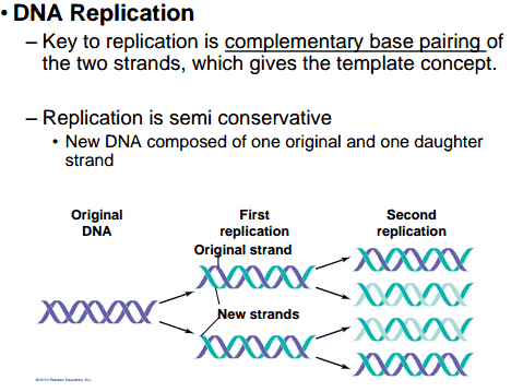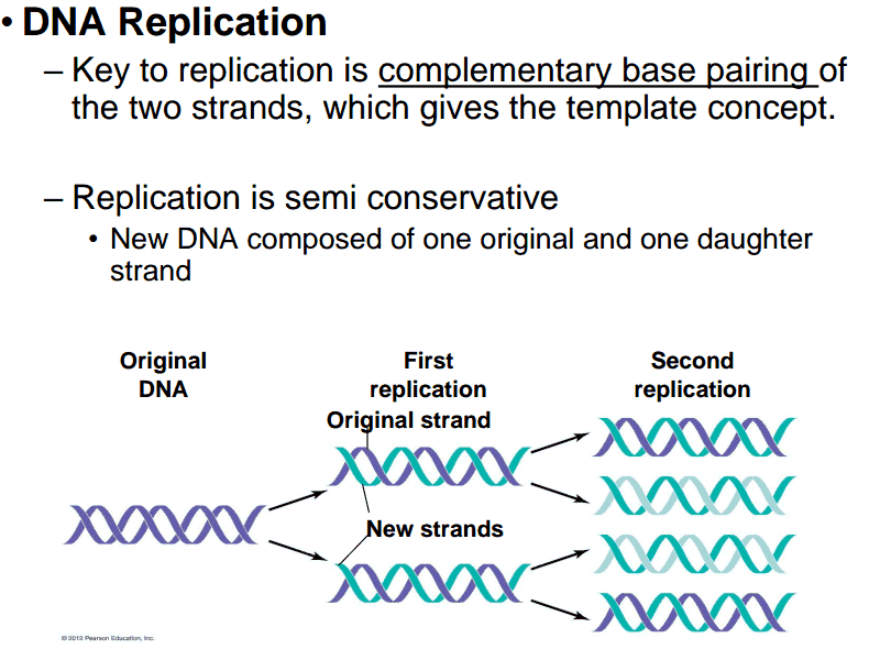 -Key to replication is complementary base pairing of the two strands, which gives the template concept.