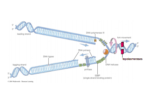 Topoisomerases- Keeps strands from becoming tangled by releasing tension ahead of helicase