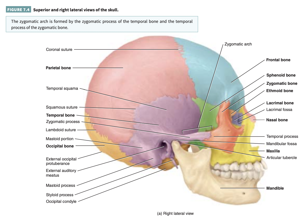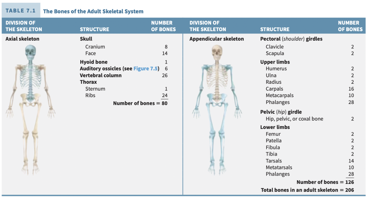 80 bones; Consists of the bones that lie around the longitudinal axis of the human body, an imaginary vertical line that runs through the body’s center of gravity from the head to the space between the feet: skull bones, auditory ossicles (ear bones), hyoid bone, ribs, sternum (breastbone), and bones of the vertebral column. The auditory ossicles are not part of either the axial or appendicular skeleton but are grouped with the axial skeleton for convenience.
