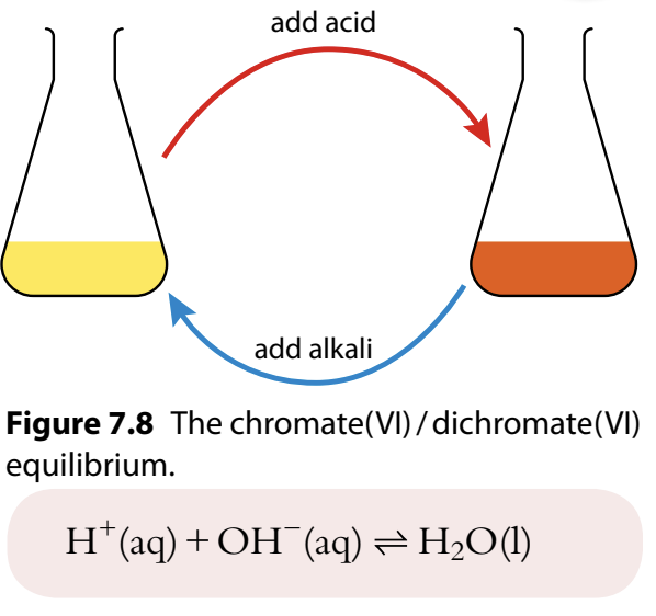If we add alkali (OH-) to the solution, they will react with the H+ ions in the solution to form water. This then shifts the position of equilibrium to the left in order to minimise the effect of the change by replacing the H+ ions