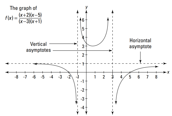 a graph of a rational function will never cross a vertical asymptote, but the graph may cross a horizontal or slant asymptote. Also, the graph of a rational function may have several vertical asymptotes, but the graph will have at most one horizontal or slant asymptote.