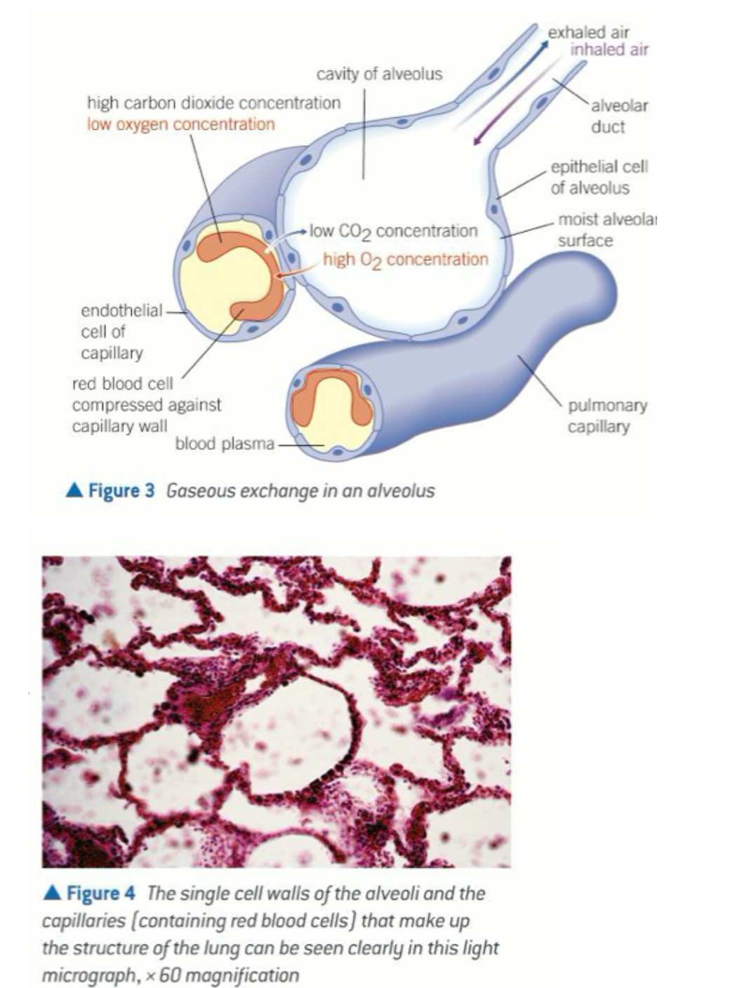 both the alveoli and the capillaries that surround them have walls that are only a single epithelial cell thick, so the diffusion distances between the air in the alveolus and the blood in the capillaries are very short.