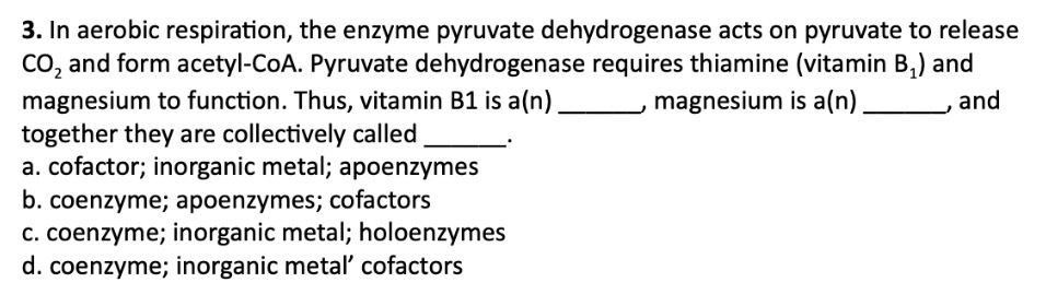 cofactor (chemical and atomns needed by enzyme….like metal ions (Cu,Fe,MG,Zn)…..like coenzymes (organic molecules, vitamins)