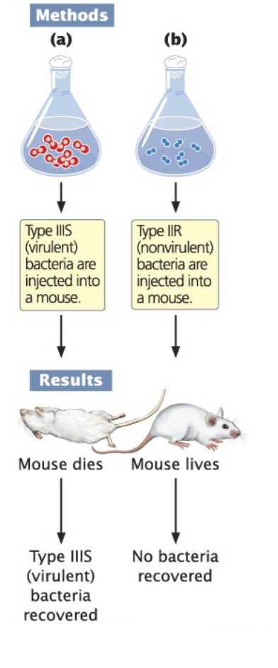 Mice were injected with a non-virulent R (rough) strain and a virulent S (smooth) strain. Griffith concluded some chemical components from the virulent S cells transformed the R cells into a more virulent S form. Griffith concluded when the R strain bacteria built a smooth shell from the instructions carried by DNA, it expressed a gene