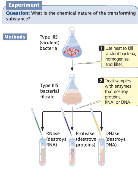 Inserted S-strain bacteria in different test tubes and then treated each tube with a different enzyme to see if it would degrade. They added R-strain bacteria, injected mice, and observed for illness.
