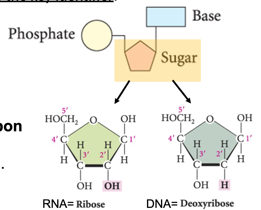 Both contain a sugar group, a phosphate, and a base. The sugar group is the key identifier.