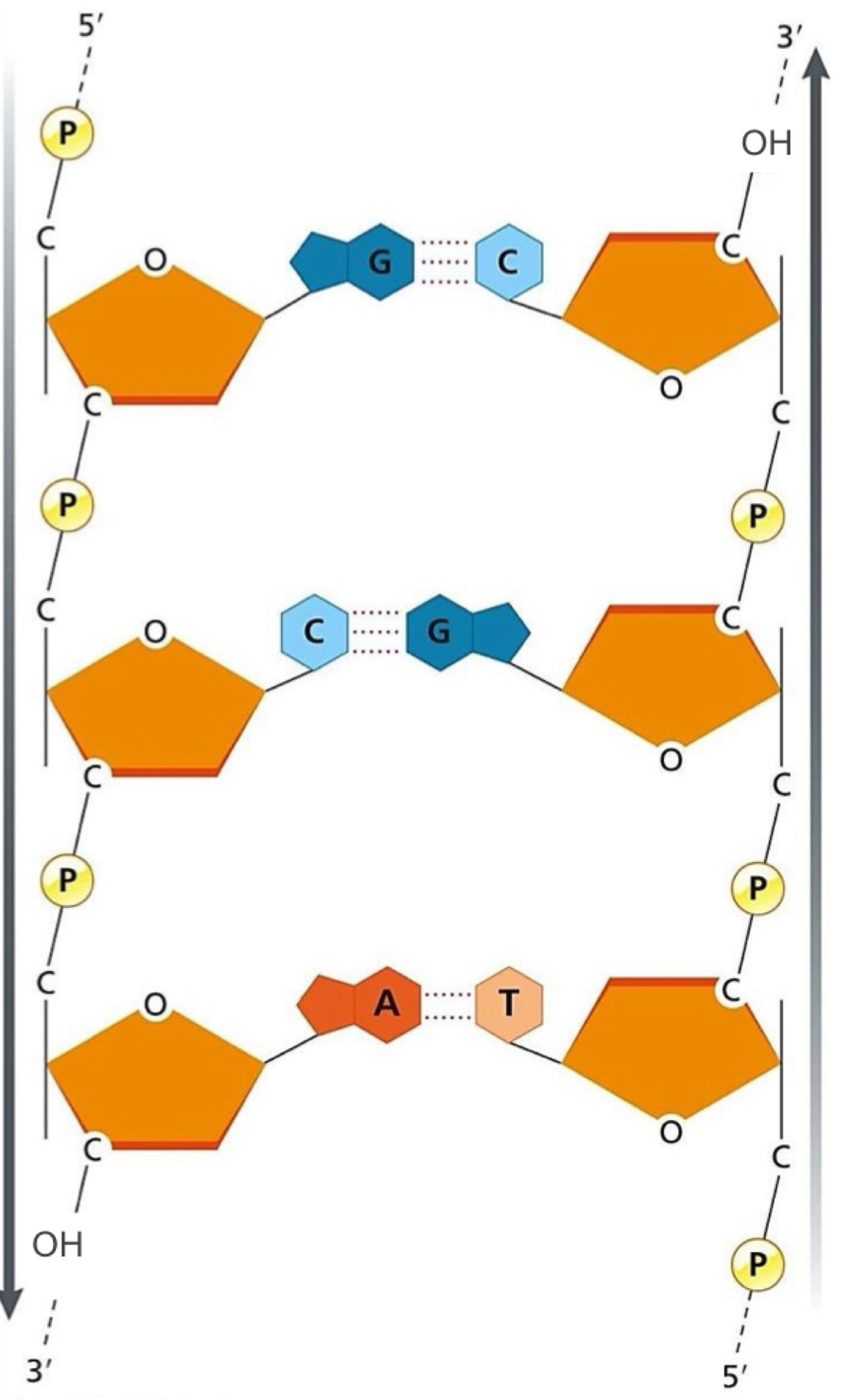 There are 3 hydrogen bonds between G and C and 2 hydrogen bonds between A and T