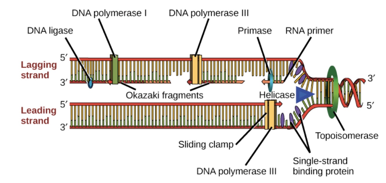 Lagging strand: Starts at 5’ end of original strand, discontinuous, goes away from replication fork